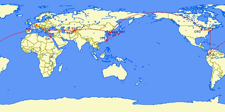 貯まったマイルを使用し、スターアライアンスのビジネスクラス世界一周チケットにて、これらをおよそ23日間で周ります。(東京台北、マドリードフランクフルト、サマルカンドタシュケント間は別予約です。)