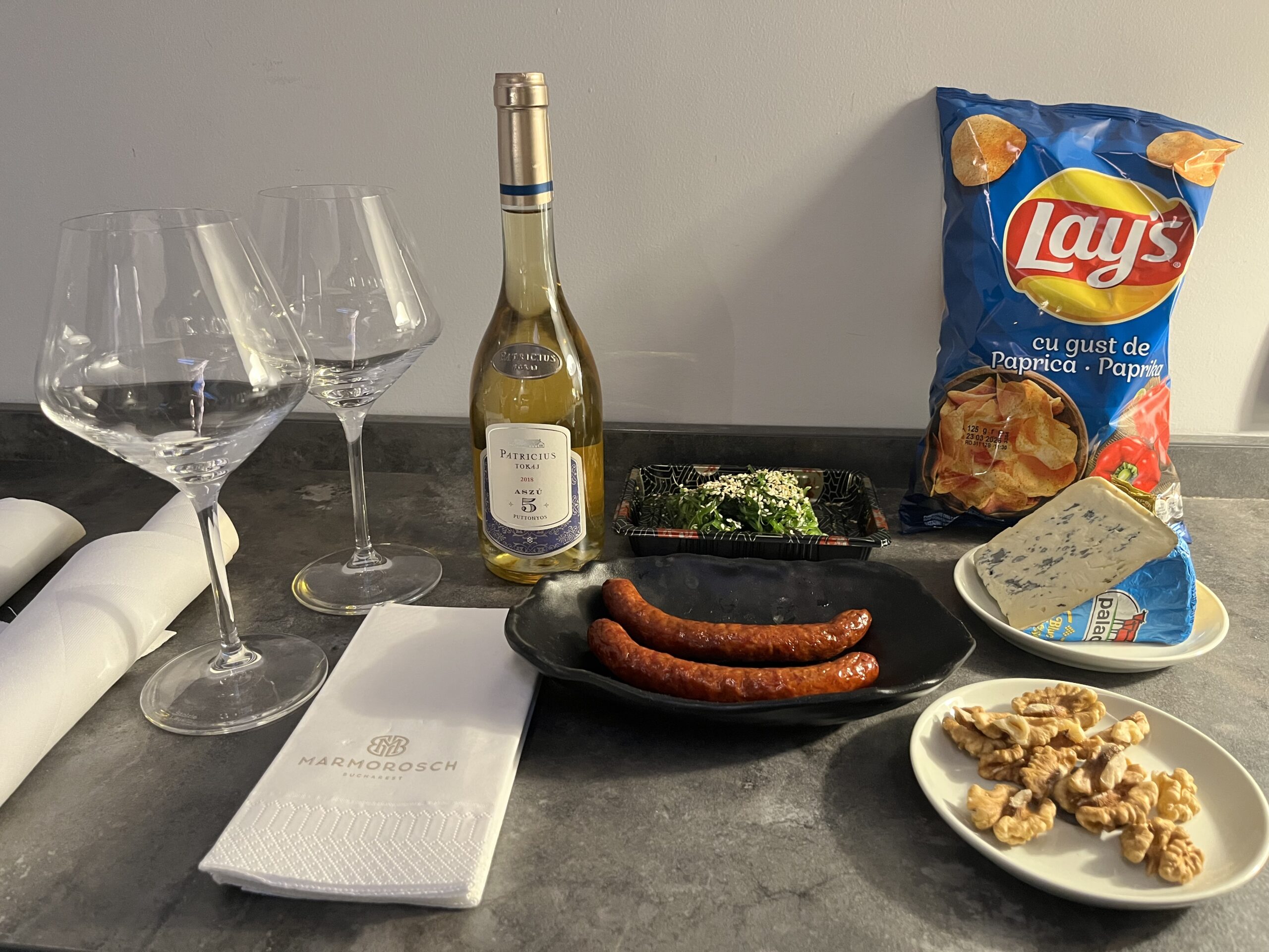 ハンガリーの空港で購入してきたデザートワインのトカイワインを開けようということになり、カルフールでトカイワインに合わせたいものを購入。