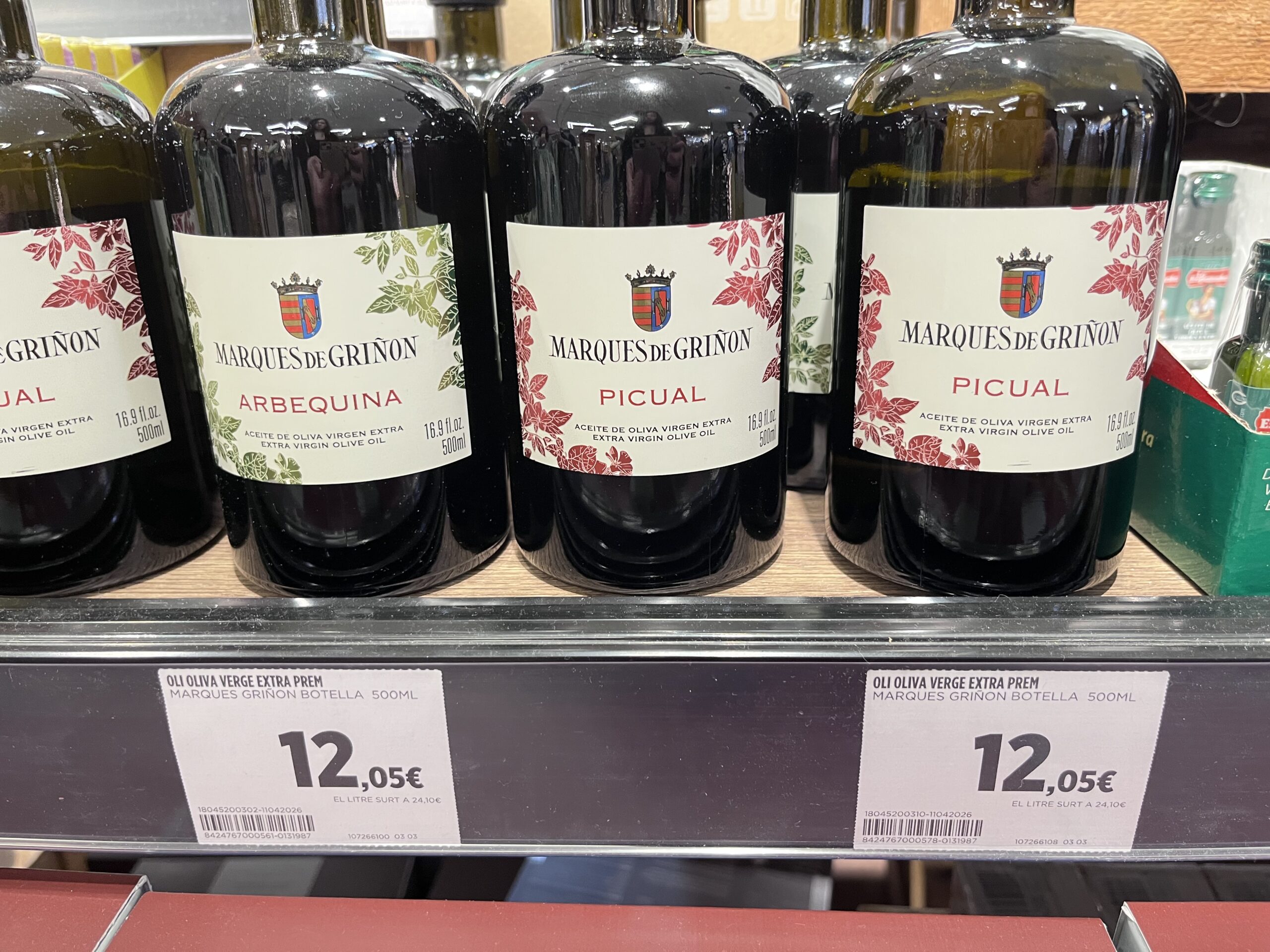 太めボトルが目を惹くMARQUES DE GRIÑÓNのオリーブオイル、前述のピクアルや、フルーティーで軽やかなアルべキーナ種のオリーブオイルです。