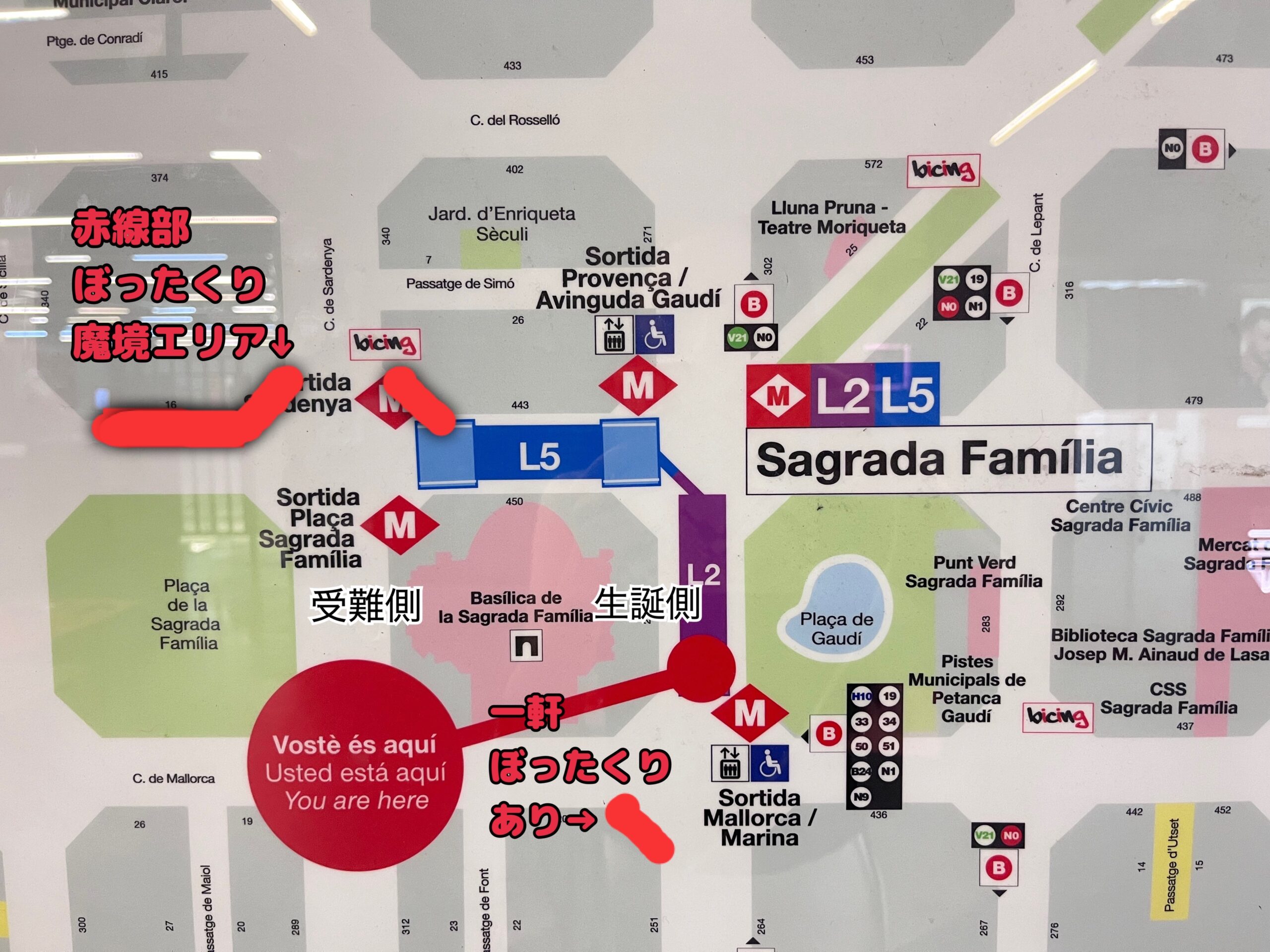 赤線部分、生誕のファサードに向かって左側の角にあるお店もぼったくり店なので注意(ヒントの写真を添えます)。